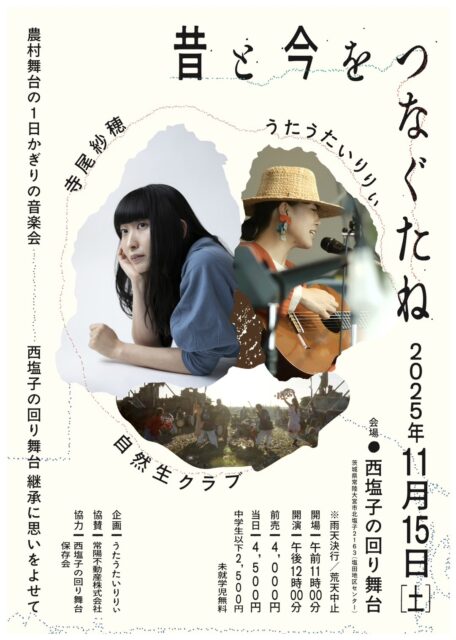 【関連イベントお知らせ-2】 2025 11/01 公演当日info 2025年11月1日 倉田@運営委員会 ◾️星に近づく夕べ2025~秋の天体と音楽 予約フォーム https://docs.google.com/forms/d/e/1FAIpQLSfyiYNhPHEv8KmAGY_jBObX3e59Fiud8oDE76X9ixhlG4Viig/viewform 公演当日info 【関連イベントお知らせ-1】 関連記事 【関連イベントお知らせ-1】 2025年11月1日 たくさんのご来場ありがとうございました 2025年10月27日 【茨城新聞】農村歌舞伎に喝采 西塩子の回り舞台 常陸大宮 2025年10月27日 運営委員長・西野先生の素敵な挨拶で締めくくる!! 2025年10月25日 見せ場たっぷり!1時間超の圧巻の演目が回り舞台を飾る!! 2025年10月25日 おまちかね、大トリを飾るのは「西若座」!始まりました 2025年10月25日 2度目の抽選会、米だぞ米、コメ〜!!! 2025年10月25日 安達勇人さん作詞「夢」、皆に希望と元気が湧いてくる素敵な歌をありがとうございました♪ 2025年10月25日 コメント コメントする コメントをキャンセルコメント ※ 名前 ※ メール ※ サイト 次回のコメントで使用するためブラウザーに自分の名前、メールアドレス、サイトを保存する。 上に表示された文字を入力してください。 Δ このサイトはスパムを低減するために Akismet を使っています。コメントデータの処理方法の詳細はこちらをご覧ください。